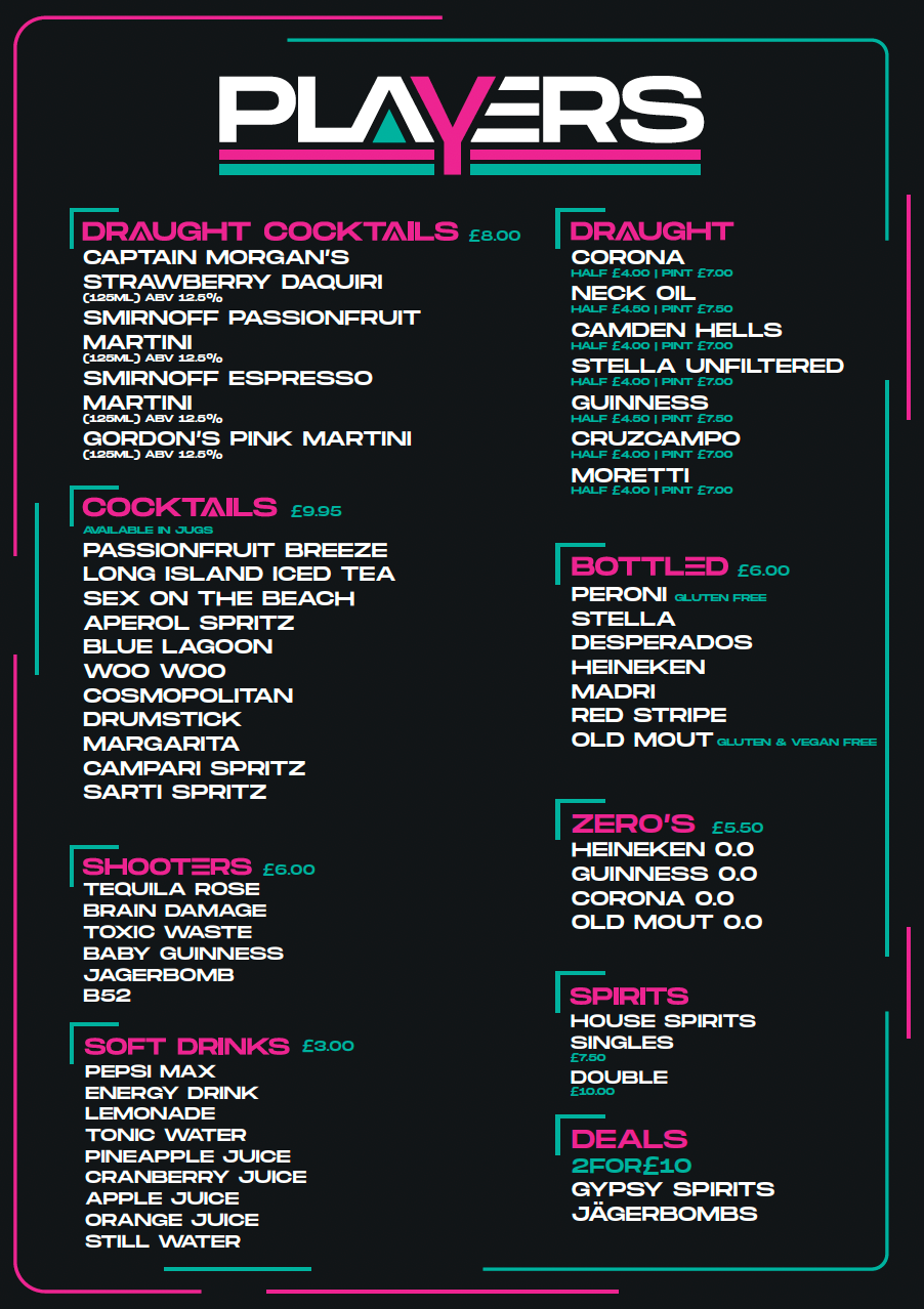 Get ready to take your taste buds to the next level with Player's cocktail range! We even have draught cocktails for a special mix and match of cocktail options!